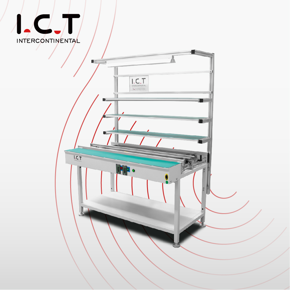 The I.C.T SMT PCB Sealing Conveyor is the perfect Conveyor Pcb Assembly Line station after reflow or AOI when boards must stay 100% clean before conformal coating or packing. A full-sealed transparent cover blocks dust and fingers while bright internal LEDs let operators see everything clearly. One-button width sync, upgraded aviation-grade aluminum rails and Industry 4.0-ready PLC deliver rock-solid reliability 24/7. Choose standard belt or heavy-duty chain — every SMT PCB Sealing Conveyor keeps your valuable boards perfectly protected and moving smoothly in high-end electronics factories worldwide.